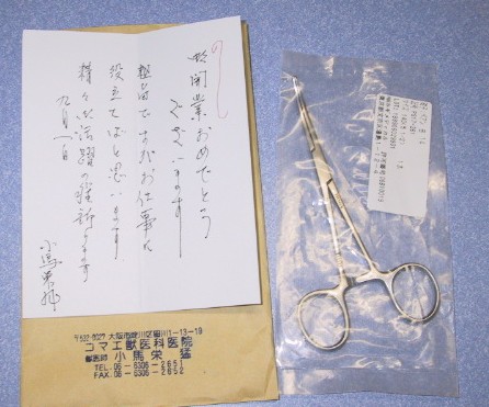 獣医師 小馬栄先生から。 仕事に使えるものをと、鉗子をお送りくださいました。 |